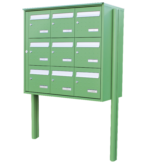 - Portes individuelles, tôle d’acier 12/10e revêtue anti-corrosion avec relief « pointes de diamant », antivol, clapet alu anodisé naturel anti-bruit, condamnées par un pêne rotatif toute hauteur anti-vandale et équipées d’un porte-étiquette inaccessible de l’extérieur.